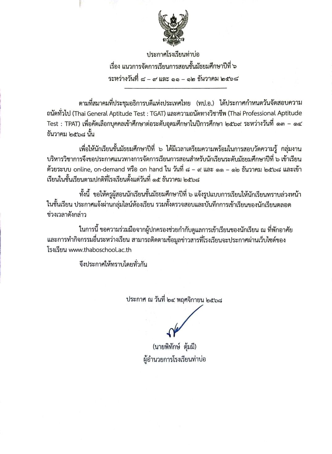 ประกาศโรงเรียนท่าบ่อ เรื่อง ปรับรูปแบบการเรียนการสอน